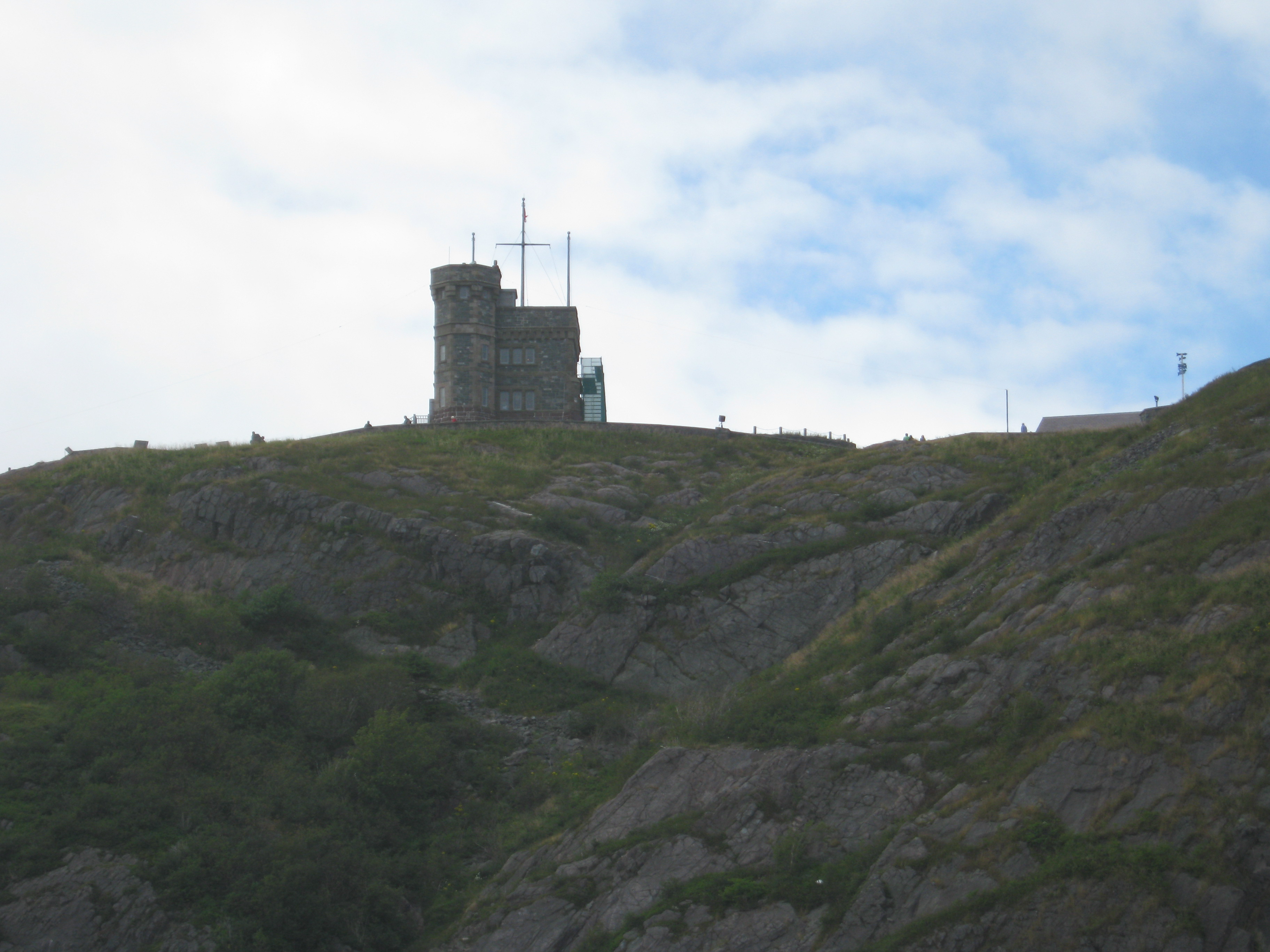 After spending a good three hours at the Geo Centre, I headed out and back uphill, stopping at the Signal Hill Visitor Centre. Gerri had recommended taking the trail up to the lookout (as opposed to just going up the sidewalk along the road), so I asked the info desk gal where I could find the trail. That was another piece of brilliant advice from my B&B host – the trail was uphill, but wound up and around in a gentler way than the sidewalk – and I took the opportunity of stopping at the Queen’s Battery to take a bit of a breather and take in the view of the harbour, the city and the Battery village below. Once up at the lookout, I got some more great views – from both the hilltop and up in the lookout.