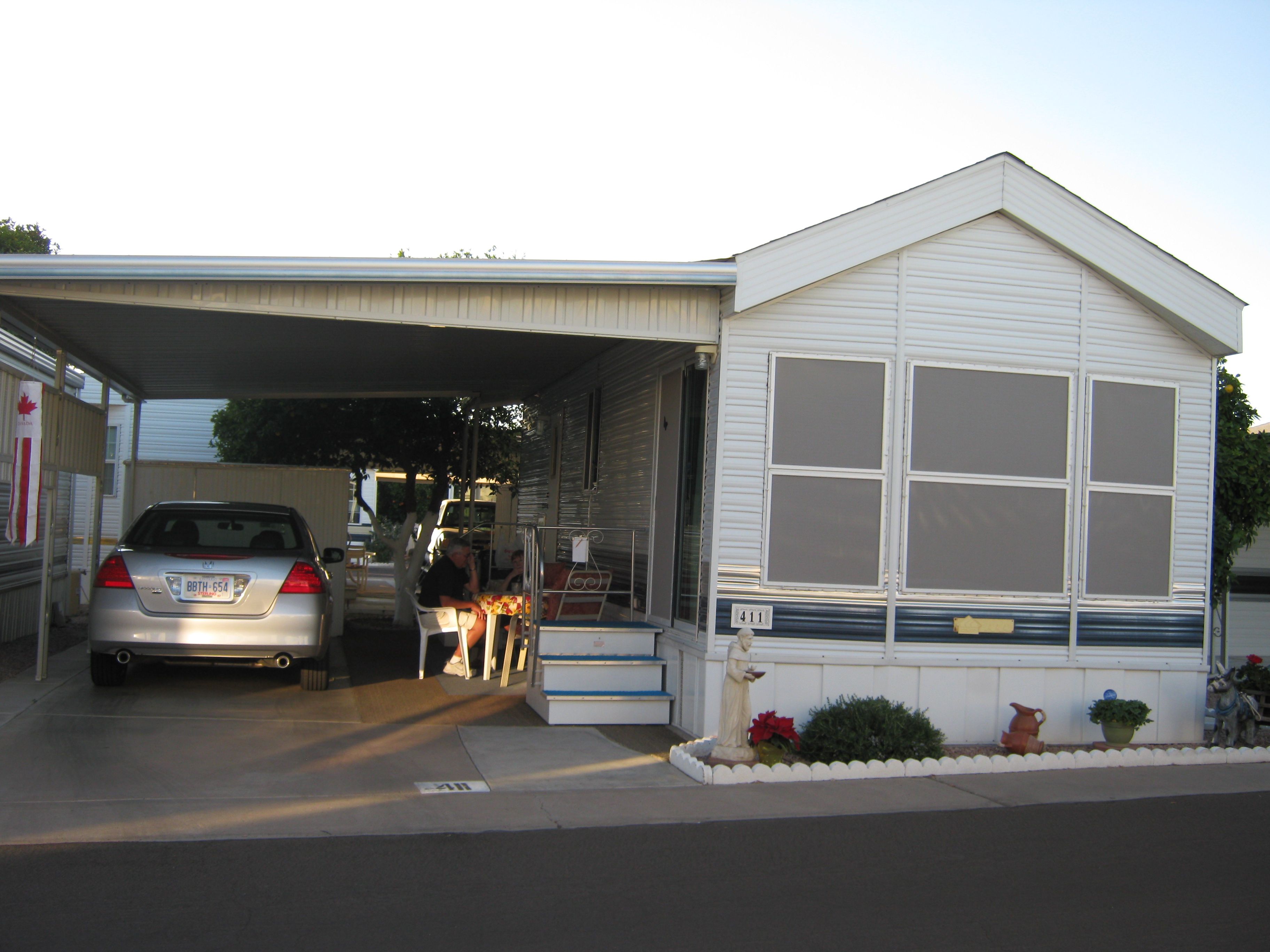 The tin can is located close to the hub of the park: the community buildings that house the office and activity rooms (a library, event hall, card room, pool table room), craft and workshop rooms, and movie room, with an outdoor heated pool for swimming, a smaller one for water volley ball and a jacuzzi/hot tub, as well as shuffleboard courts, adjacent to the buildings. There are organized activities, dinners and events galore that the residents can sign up for (you have to be 55+ to have a place there) – and the schedules my folks had up on their fridge showed a very full week, and my mum and aunt were busy organizing their annual Canadian breakfast on top of their regularly scheduled stuff.