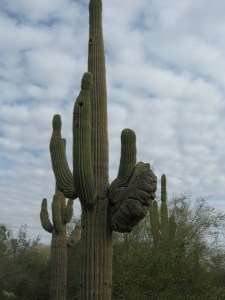 Throughout my time in Arizona, I noted how the saguaro could dominate the desert landscape. On the way back from the Grand Canyon trip, the further south we got, the more we saw (they thrive at a particular elevation – though we did see a few anomalous saguaro a bit south of Flagstaff) – including dozens of them side by side, army-like on a rocky, scrubby hilltop. They can live for a couple hundred years and don’t start producing arms till around age 45. And, at the garden, we learned that they have skeletons – which, I suppose is what keeps them upright, since their desert-thriving root system is only a couple of inches deep, but spread very wide underground. The skeletons resemble ribs – and these expand and contract along with the level of water content.