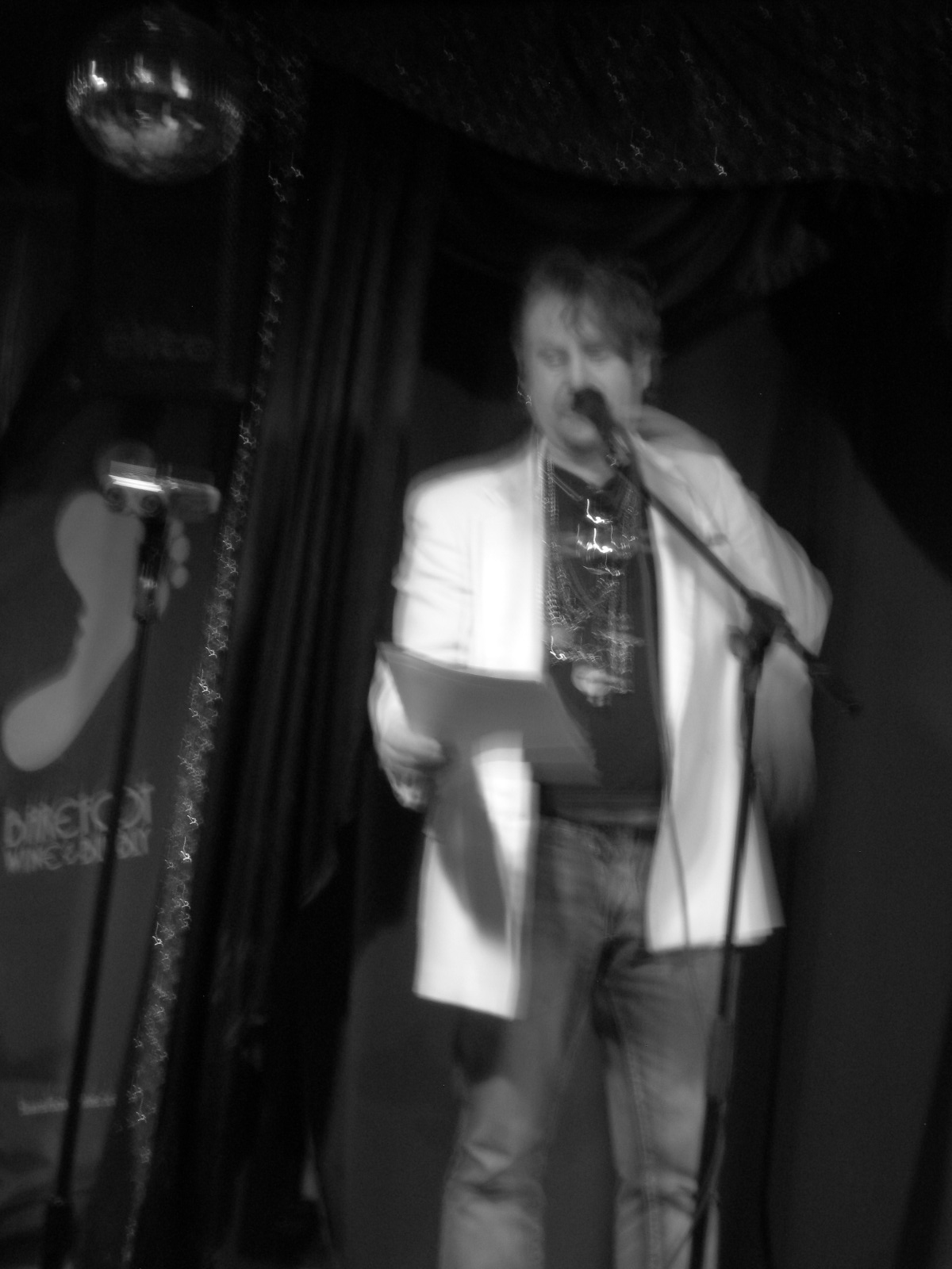 Featured performers included writer/poet/editor/horror aficionado Lizzie Violet (http://lizzieviolet.wordpress.com/), who read a selection of poems, giving us a great, eerie fun mix of horror, sex and haiku with frankness, art and wryness of wit (my fave is Chlamydia is Not a Flower!, about her mum’s avoidance of the sex talk – and which her mum has stuck on her fridge).