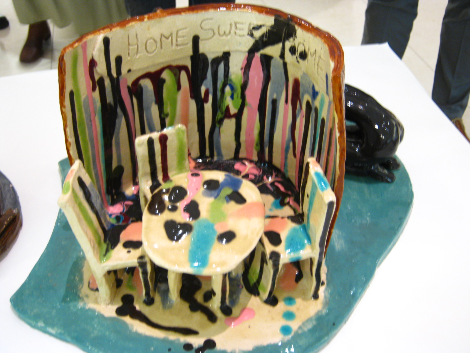 Siobhan Boyd, Gardiner Museum Programmer, and Lynn Jenkins, Director of Counselling Services at the Barbra Schlifer Clinic, spoke of the museum/clinic partnership and introduced the sculpture group’s facilitators: art therapist Suzanne Thomson and artist Susan Low-Beer (and Susan just made it in on time, through traffic from Pearson airport, to be at the exhibit). Two of the artists from a previous exhibit spoke of their positive experiences working with their sculpture group and were happy to return and see the responses in the current exhibit. One of the current artists, accompanied by a friend for moral support, read a poem: For Children Who Are Broken, by Elia Wise, and did an excellent job despite the nervousness. Another artist shared a recording of a song that has brought her inspiration: Juanita, by Shania Twain.