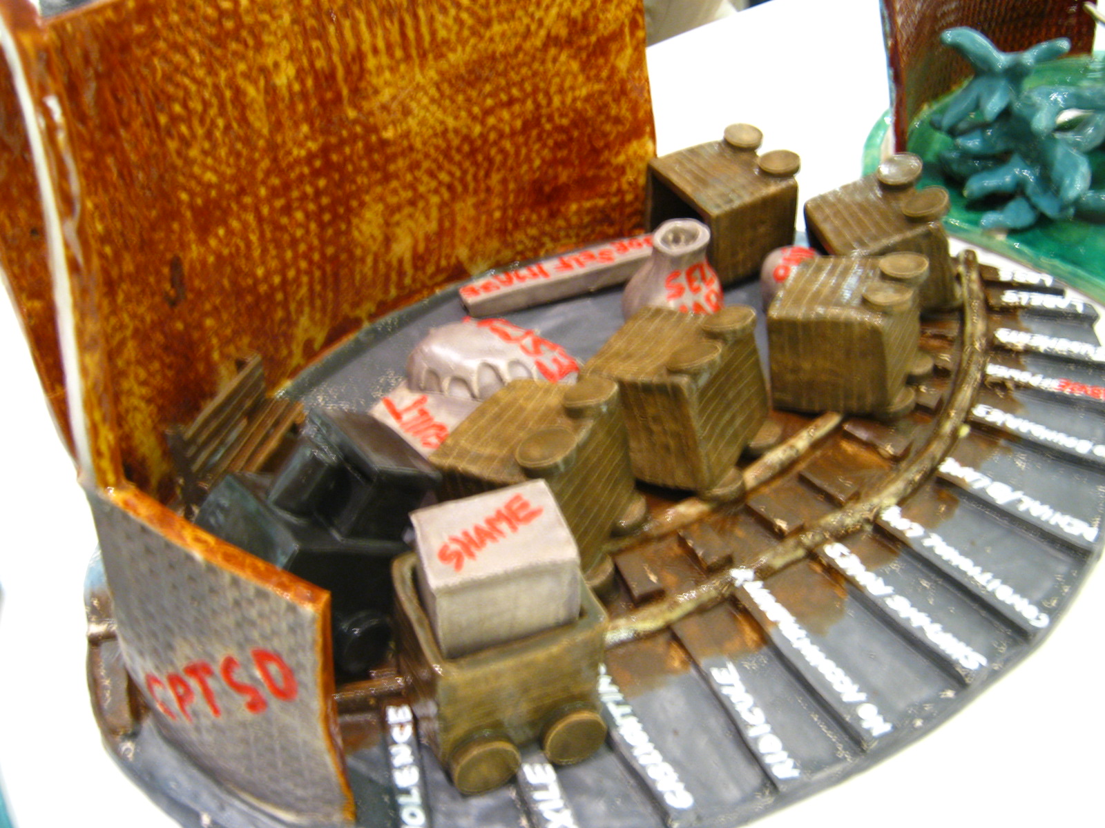 The exhibit was a one night only event, and guests were there by invitation and were provided with artist statements about the work. The work is powerful, beautiful and diverse in the images chosen and techniques employed. Due to the sensitive nature of the subject matter, several of the artists chose to be anonymous. I received permission from one of the artists to post photos of her piece Depiction of a Journey in this blog – and I thank her for her courage, her work and her trust. She likened the process of creating this work to a trip down into the Grand Canyon on a burrow, sure-footed creatures who know the path. As you wind down the narrow rock trail with no guard rail, you need to remember: Trust the burrow. And she takes inspiration from the Walt Whitman quote: “Re-examine all you have been told. Dismiss what insults your soul.”