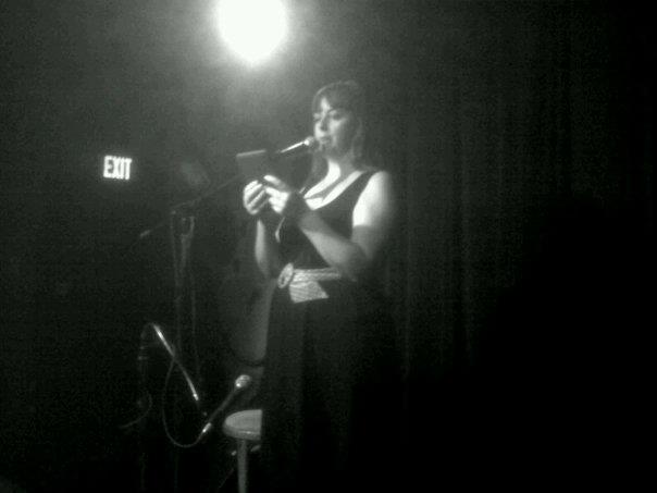 Last night, I had the pleasure of dropping by open mic night at Free Times Café to hear Lizzie read some of her work. Pretty sure this was her first time reading there – and, despite TTC challenges causing her to be running a bit late, she arrived looking fabulous, checked in with host Jeff Kahl, then hung out with Brandon Pitts and Jennifer and me for a bit at our booth near the back room (as it was packed with no seats left) before shortly getting called on stage. She read some of my – and Jeff’s – favourites: the devilishly mischievous and fun piece about her childhood invisible friend Sid, the hilarious mom blurt piece “Chlamydia is Not a Flower,” and the very funny and sharply pointed unsubstantiated relationship piece. She avoided the naughty haikus, as there were minors present, but read us a few back at our booth. They’re very erotic. Seriously erotic. I wasn’t able to get close enough for a decent photo while she was reading, but thanks to host Jeff Kahl, here’s a stunning pic of Lizzie – it puts me in mind of classic cabaret: smoky and shadowy.