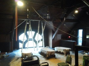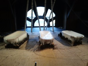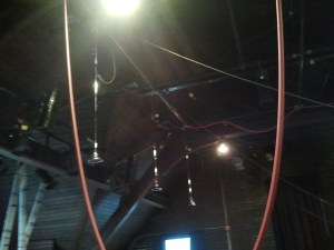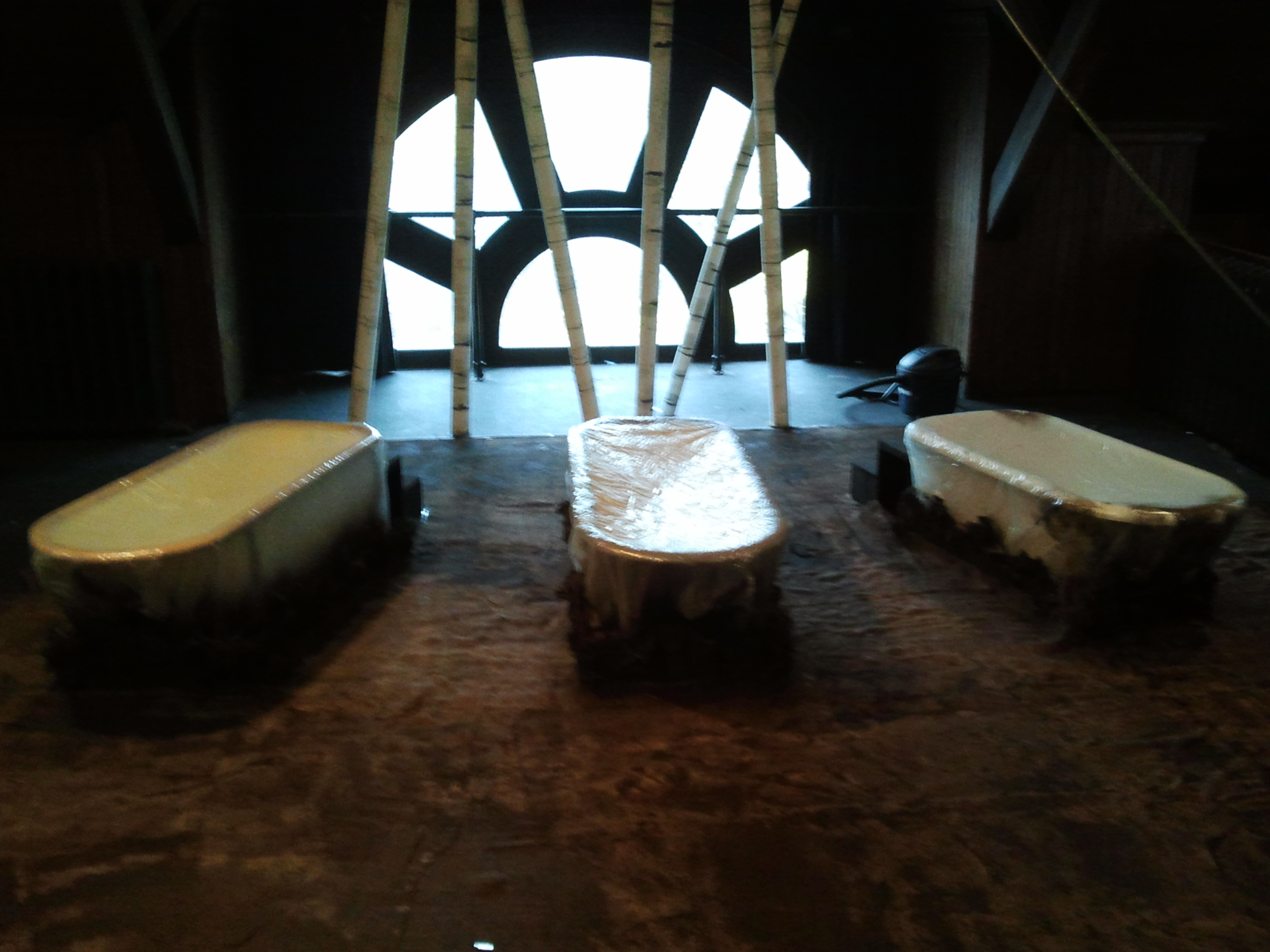 I’ve included some in-progress shots of the set. Yep, those are three old-fashioned footy bathtubs – fibre glass so they were less cumbersome to cart up to the third floor of the theatre. The floor is painted burlap. We required a little practical problem-solving yesterday: the latex paint was coming off on the actors, who are wet from the tubs. Thanks to Peter Fortier at Prime Time Paint & Paper, Ed found a solution: a hybrid oil/water varnish that we can use to glaze the floor.
