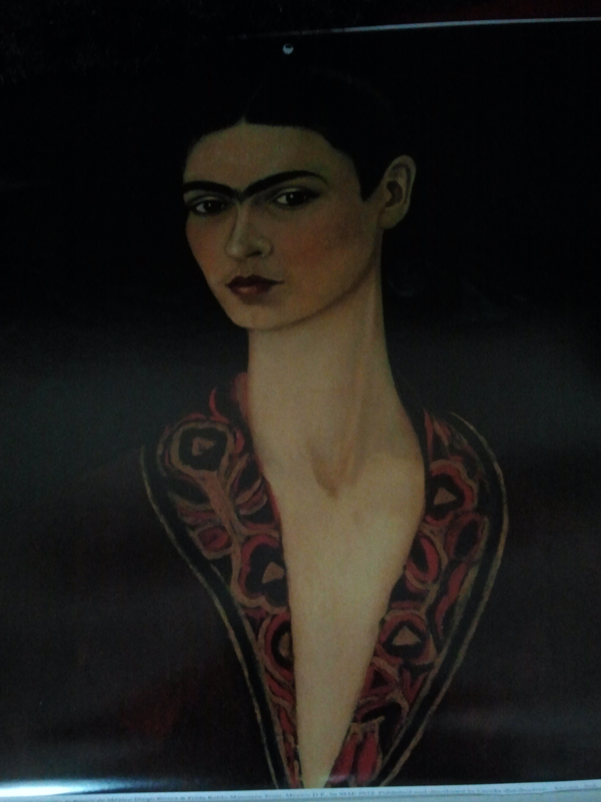 Photography was not permitted in the exhibit room, but I purchased a 2013 calendar with prints of Kahlo’s work, including this luminous self-portrait I’d never seen before.