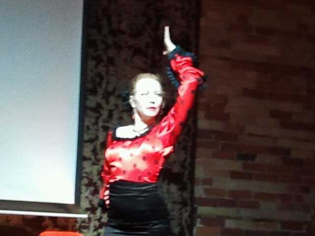 By the bar were some canvasses by Alex Flores, painted in a style reminiscent of Frida Kahlo, the portrait of a woman particularly striking. A slide show of Ruth’s trip to Spain flickered across a screen upstage, featuring stunning colours and sights, including images of a bullfighting ring and bullfighters. Introductions from TINARS and Cormorant Books, and then we were treated to the sights and sounds of Flamenco: dancer La Mari, with singer Maria Assunta and guitarist Juan Dino Toledo. A passionate spectacle, the music and voice haunting and powerful, the dance strong and proud.