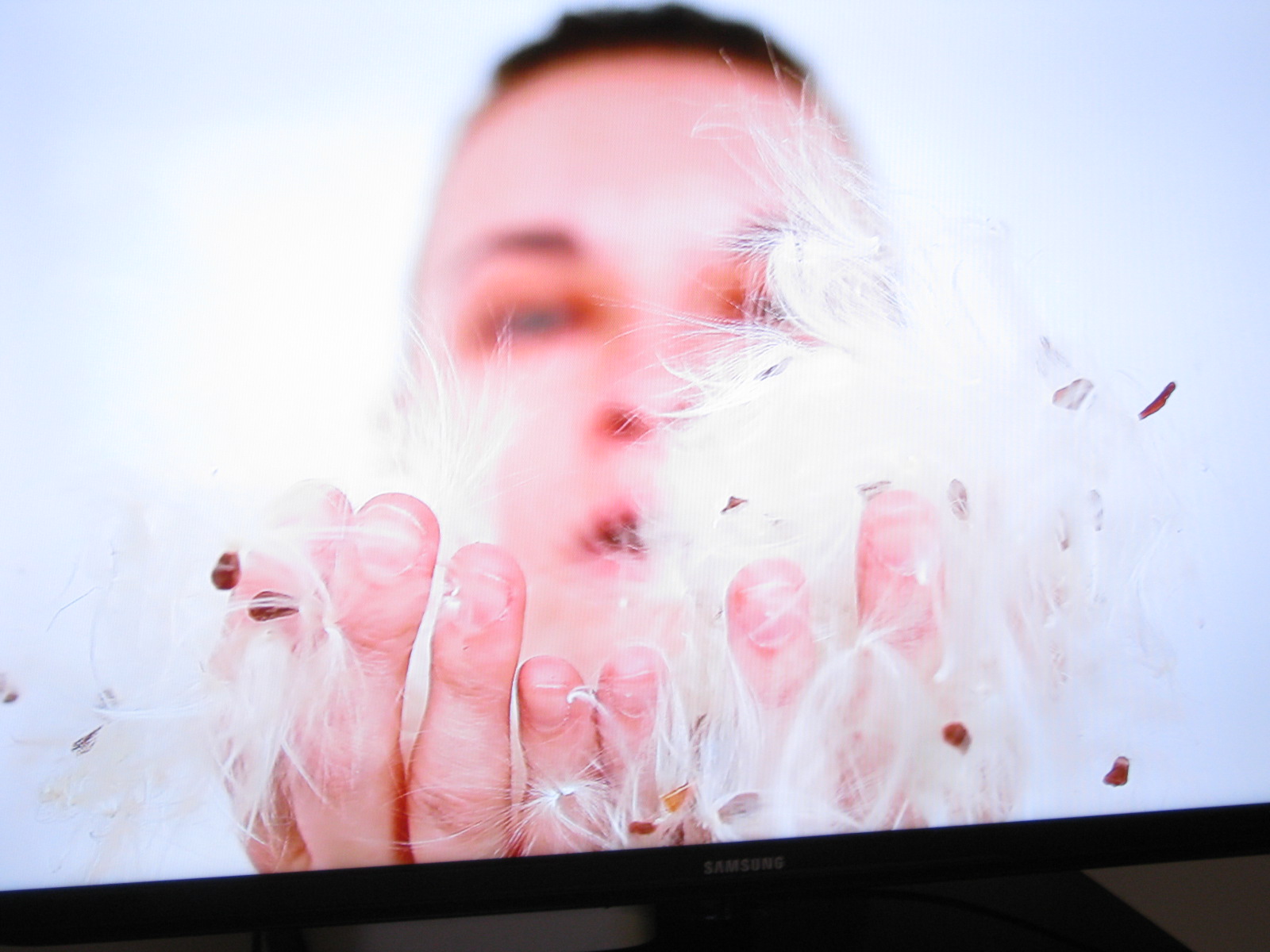 In the smallest exhibit space are two monitors, facing each other from opposite sides of the room. Each plays a video on a two-minute loop with no sound – both close-ups of Vitasek’s face. One shows the artist doing a breathing exercise – in through the nose and out through the mouth. On the other, the artist has her hands full of milkweed, her face in the background as she gradually blows the white fluffy, seed covered stuff off her hands – the last tuft becoming airborne with one puff of breath. The videos speak to each other even as each speaks to the viewer – and I found that, after a few moments of standing in front of the breathing exercise, the rhythm of my breathing fell into sync with Vitasek’s. Of the two videos, the breathing exercise is also the most challenging to witness. It has a rawness to it, an intensity that stands in sharp contrast to the more whimsical milkweed blowing video, where the artist’s face is in background focus.