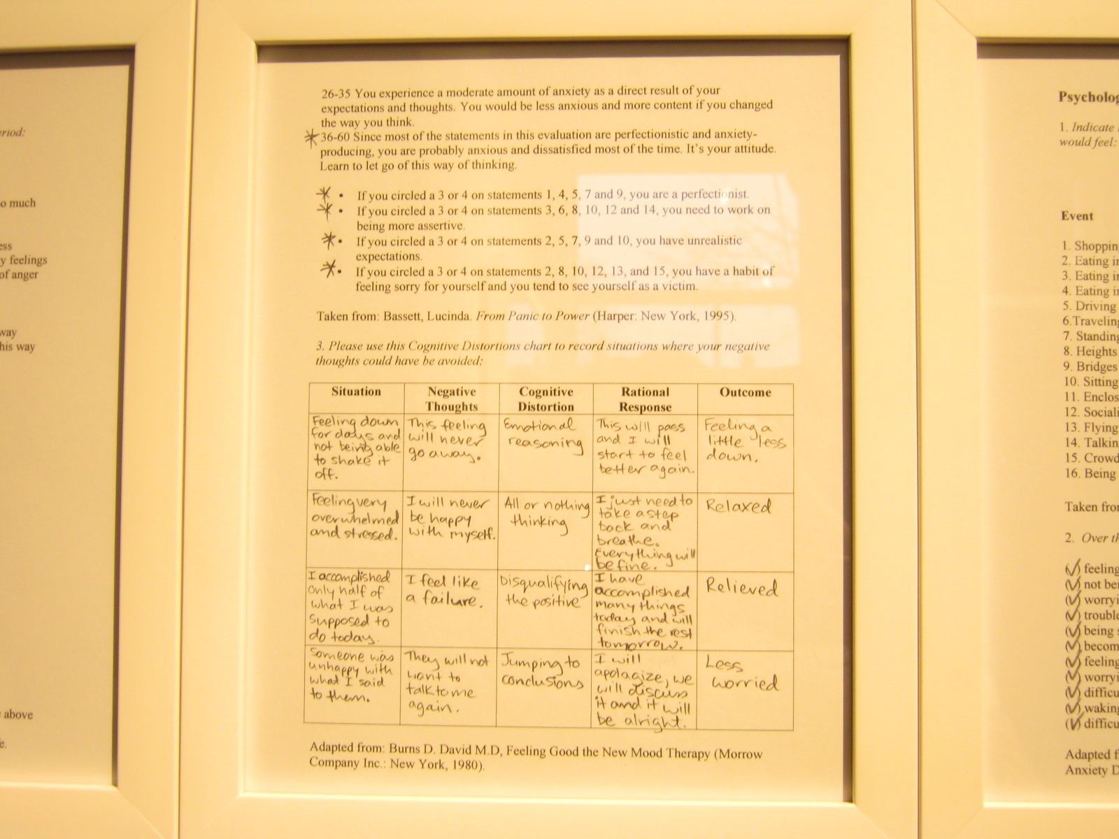 On the wall between the two spaces are three framed questionnaire pages, taken from two anxiety questionnaires. Each has been filled out, boxes ticked and statements regarding behaviour rated on a scale, along with written descriptions of anxious moments addressed by cognitive therapy responses, along with the outcome. As I read through them, I couldn’t help but mentally fill out the questionnaires myself. How often do I avoid, and how anxious do I feel about, being alone? Being in a crowded space? Travelling?