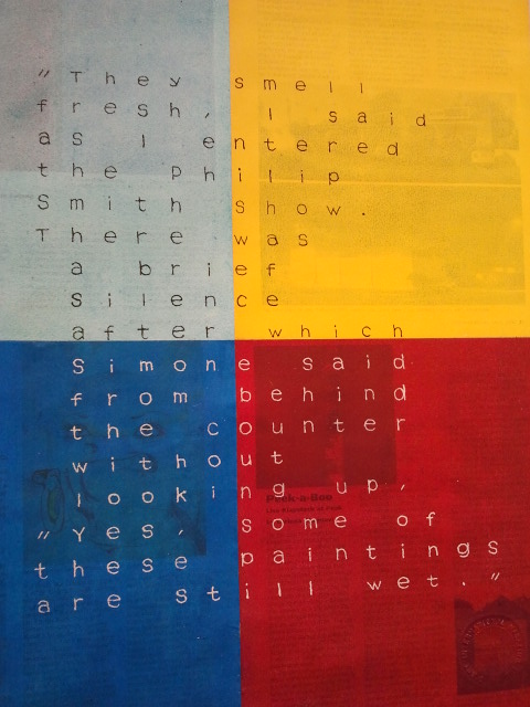 Text. From Meditations on Space, a narrative performance piece – later produced in a book detailing Rockwell’s exploration of and interactions in gallery storage spaces, recording his impressions in both text and photographs as he visited galleries in Toronto, LA, New York and locations in Europe. In the book, each gallery blurb is a short text piece, about the length of a tweet – only, in this case, the experience was physical instead of virtual – each one a funny, surprising and detailed description of his interaction with gallery owners and the space. And the photographs include some whimsical shots of his self-portrait in the storage spaces.
