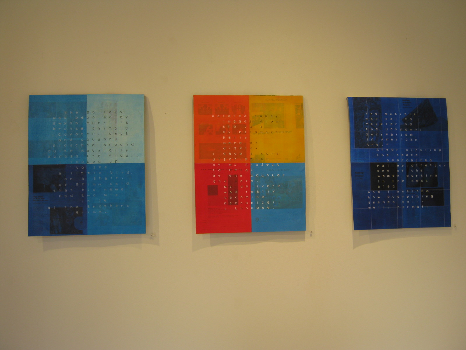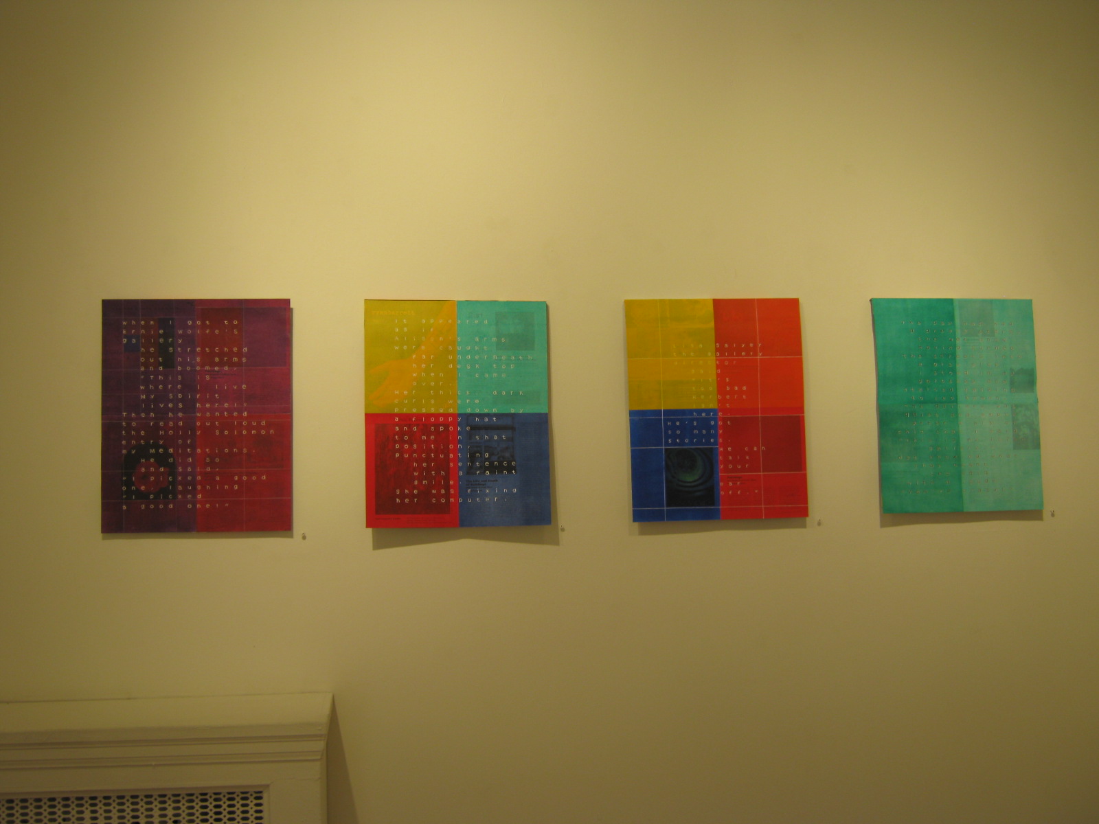 The Folio exhibit is a series of 13 ¾” X 17” unframed, protectively coated pieces on paper, hung in such a way that each is set slightly away from the wall, moving banner-like with the air currents in the room. The four-colour grid used in each brings to mind the family standards of heraldry – like in Game of Thrones – and most include hand-written text, in black or white, from Meditations on Space. Others have no text, but the original magazine page text and images can be seen through the paint.