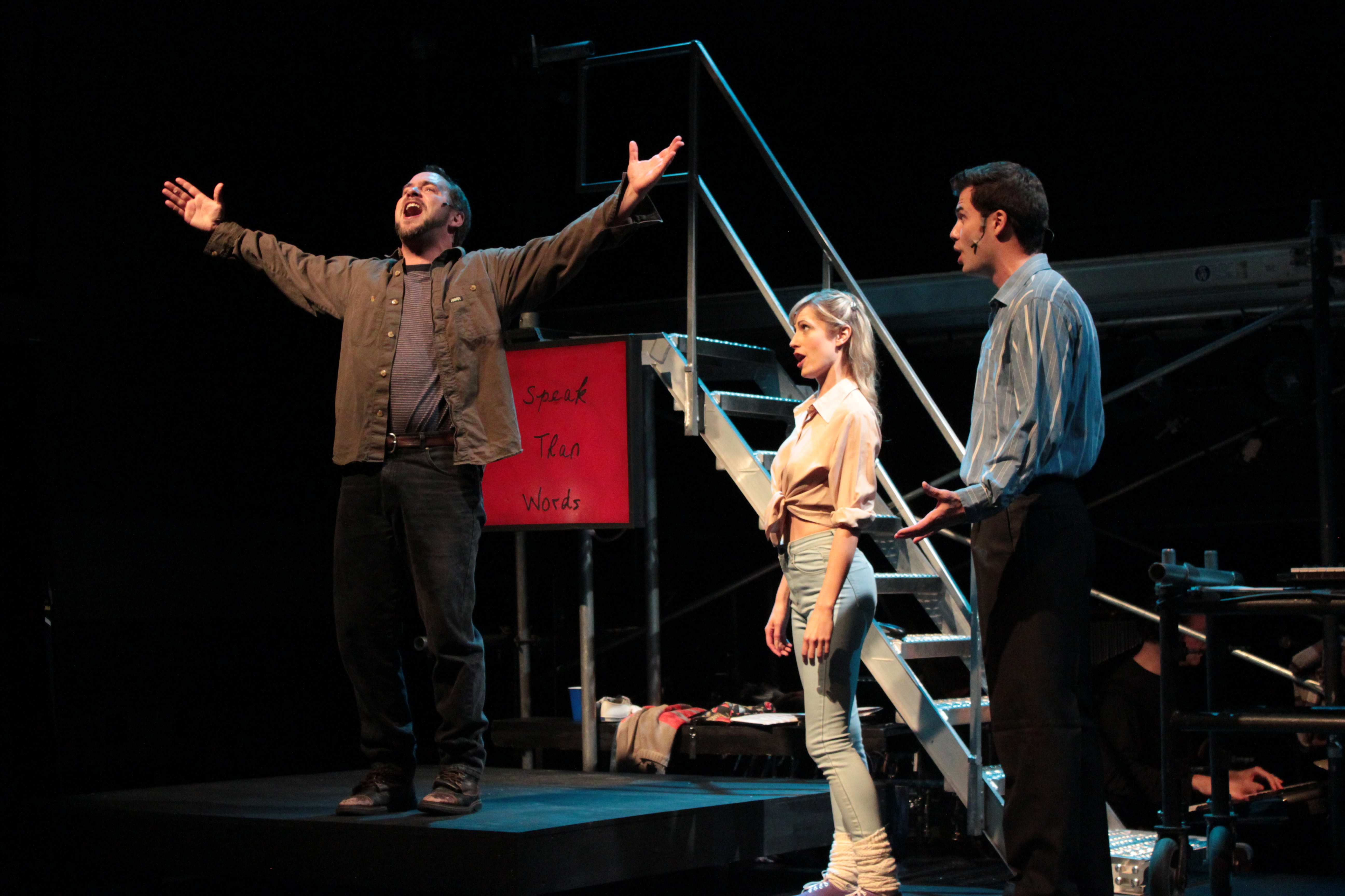 The show features some incredible harmonies – duets and trios – and the cast blends their voices to make those chords resonate beautifully. Powerful ballads “Real Life,” “Come To Your Senses” (a stand-out performance from Nason in the musical workshop within the musical) and, especially, the finale “Louder Than Words” (which includes the lyrics: “Cages or wings? Which do you prefer?”) make this an inspirational, truthful and heartfelt piece of musical theatre. The cast brings the right balance of humour and poignancy to their performances: Greaves as the artist struggling for his work, his soul and connection with his loved ones; Chamberland as his best friend, supportive but choosing another path to make a life of his own, both men wondering if they can still connect now that they’re living such different lives; and Nason as Jon’s loving and loyal girlfriend, hoping that her dreams will match that her lover – and both having to decide whether it’s possible. And Chamberland and Nason are more than up to the challenge of juggling multiple roles, including restaurant co-workers and patrons, Jon’s parents, his agent (both get a crack at her, with hilarious results!) and a lovely actress in Jon’s workshop.