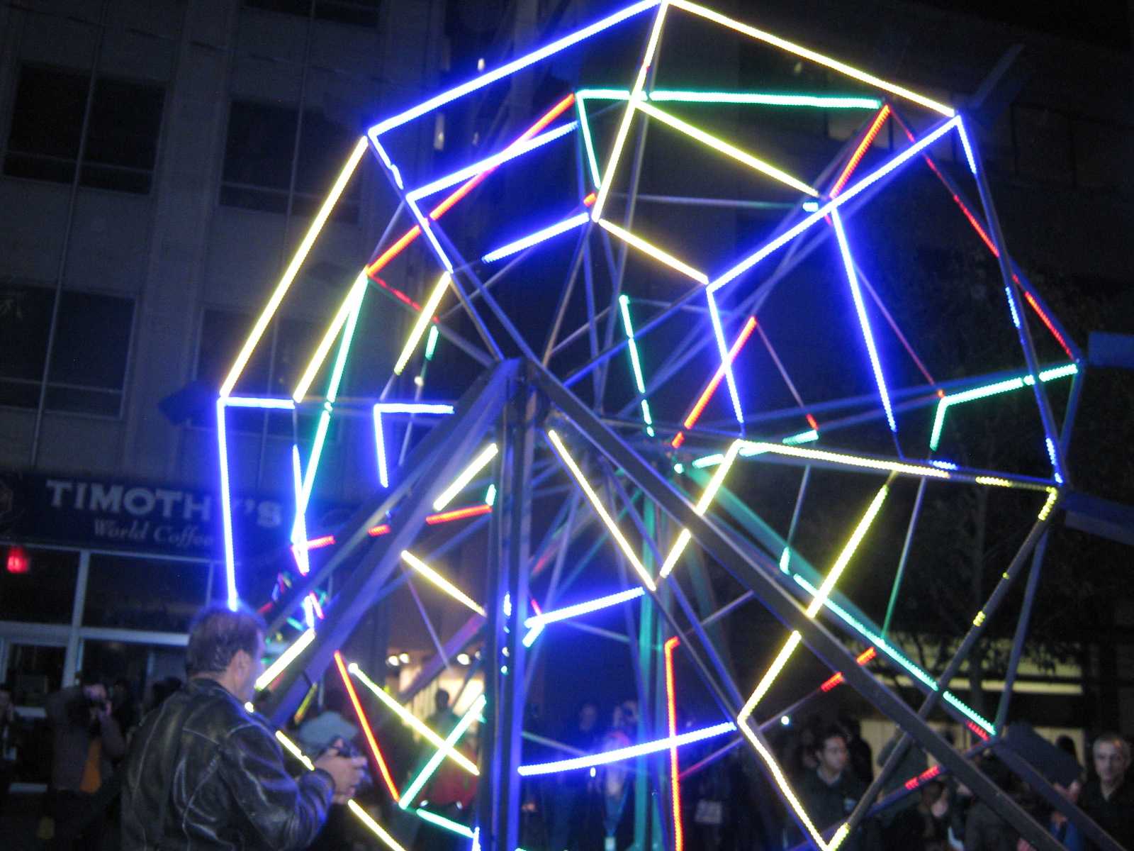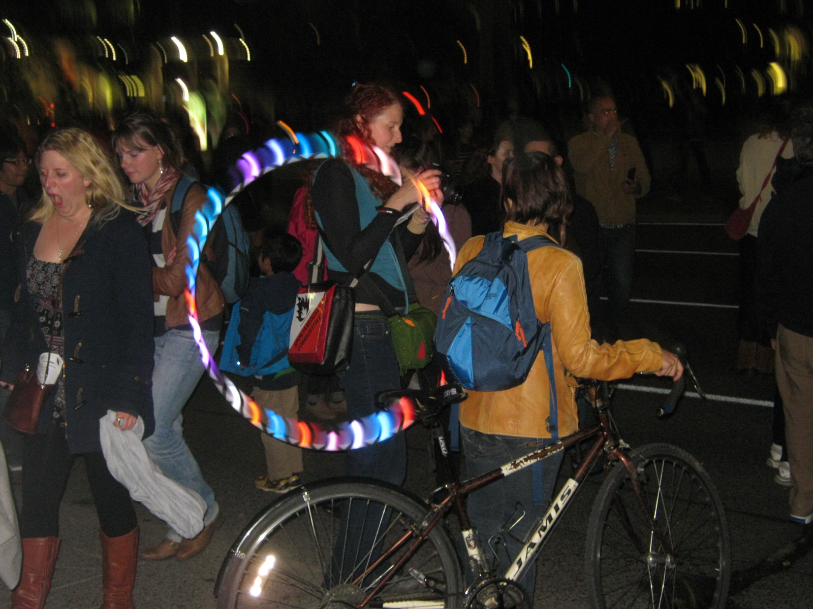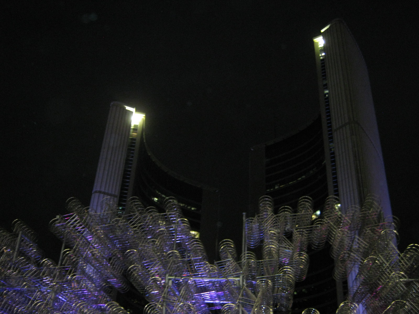The Queen of the Parade, by Lisa Anita Wegner & Vanessa Lee Wishart. Multi-media artist/performer Lisa Anita Wegner, as the Queen, waves to the crowd from atop a 20-foot high gown.The Queen of the Parade – gown detail.Tortoise, by Michel de Broin. One of a series of assemblage sculptures made from picnic tables outside Campbell House. You could smell the cedar on this pleasantly cool fall evening. Warm cider was served there as well.Music Box, by John Dickson. A kinetic sculpture of musical instruments, creating eerie, otherworldly sounds all based on parts moving against each other.Ai Weiwei’s Forever Bicycles installation at Nathan Phillips Square.Forever Bicycles installation with Toronto City Hall in the background.Ferris Wheel, by Katharine Harvey.Parallax, by Idea Design Collective. A luminous, beehive-like effect – all done with cardboard tubes and light.(X)Static Clown Factory, by Ruth Spitzer & Claire Ironside. An interactive performance installation, where folks were invited to come up and do the clowns’ work. I think peeps got paid in balloons.Woman in the crowd with neon light hula hoop.There is an elephant in the truck, an indie installation by Laurence Vallières. Another impressive piece done with cardboard.Hybrid Globe, by Arthur Wrigglesworth, Mohammad Mehdi Ghiyaei & Mojtaba Samimi.Ad Astra, one of three indie projects by [R]ed[U]ux Lab at the Bata Shoe Museum.RevitaLight – another piece utilizing cardboard – at Bata Shoe Museum.Light_Scape, an interactive light installation at Bata Shoe Museum.On the way to Artscape Wychwood Barns, we encountered this sculpture artist at work on Bloor Street West. He uses only centre of gravity and balance to build these pieces.Yep, that’s a concrete block balancing on top. And set on fire to great effect.An assistant moves a piece on Chess Set, by Blandford Gates, an indie installation at Artscape Wychwood Barns.Chess players Tomas Krnan (L) and Peter Vavrak (R) play blindfolded, giving verbal instructions to their respective assistants to move pieces on the board. And having to remember where every piece is.