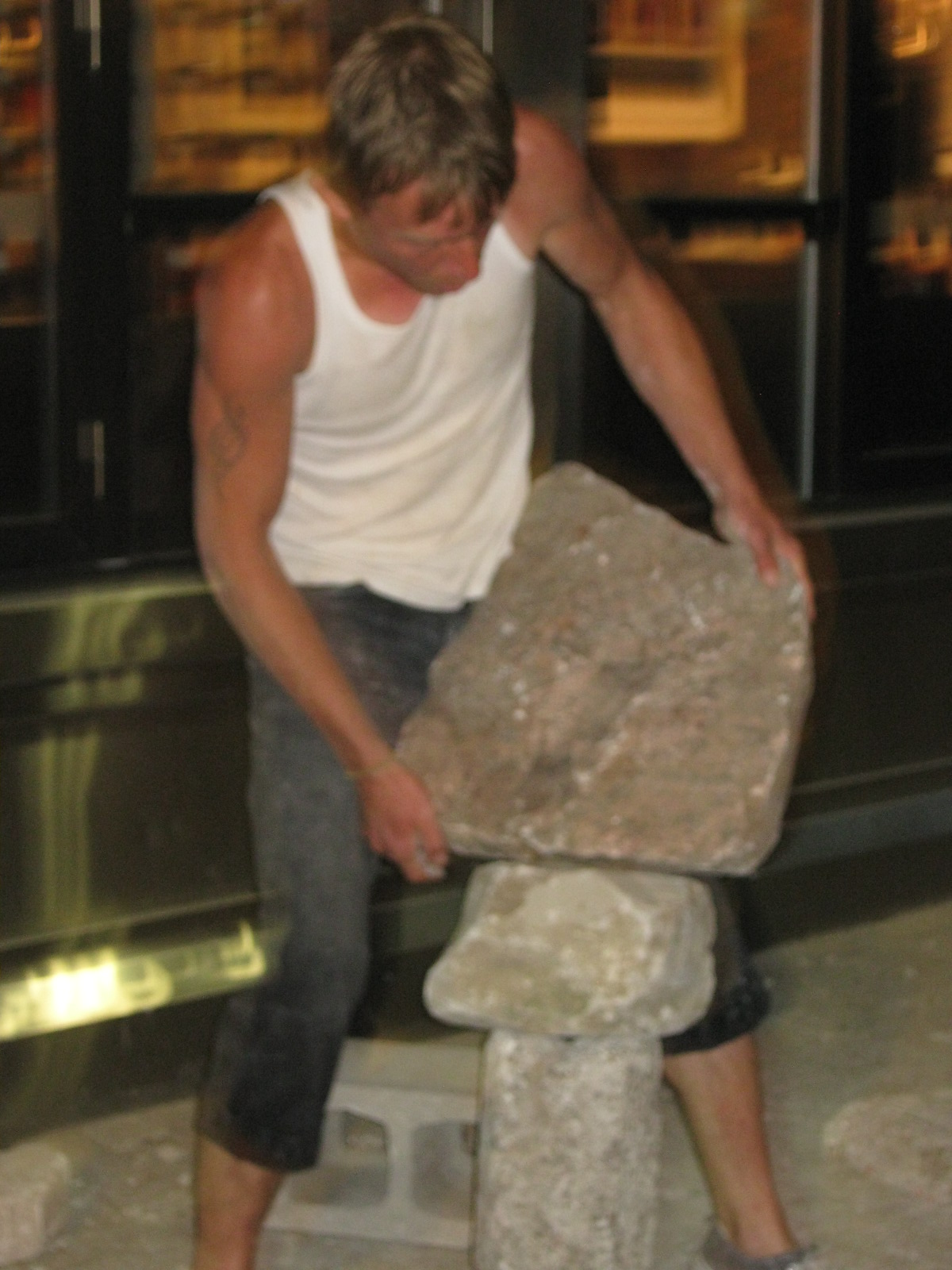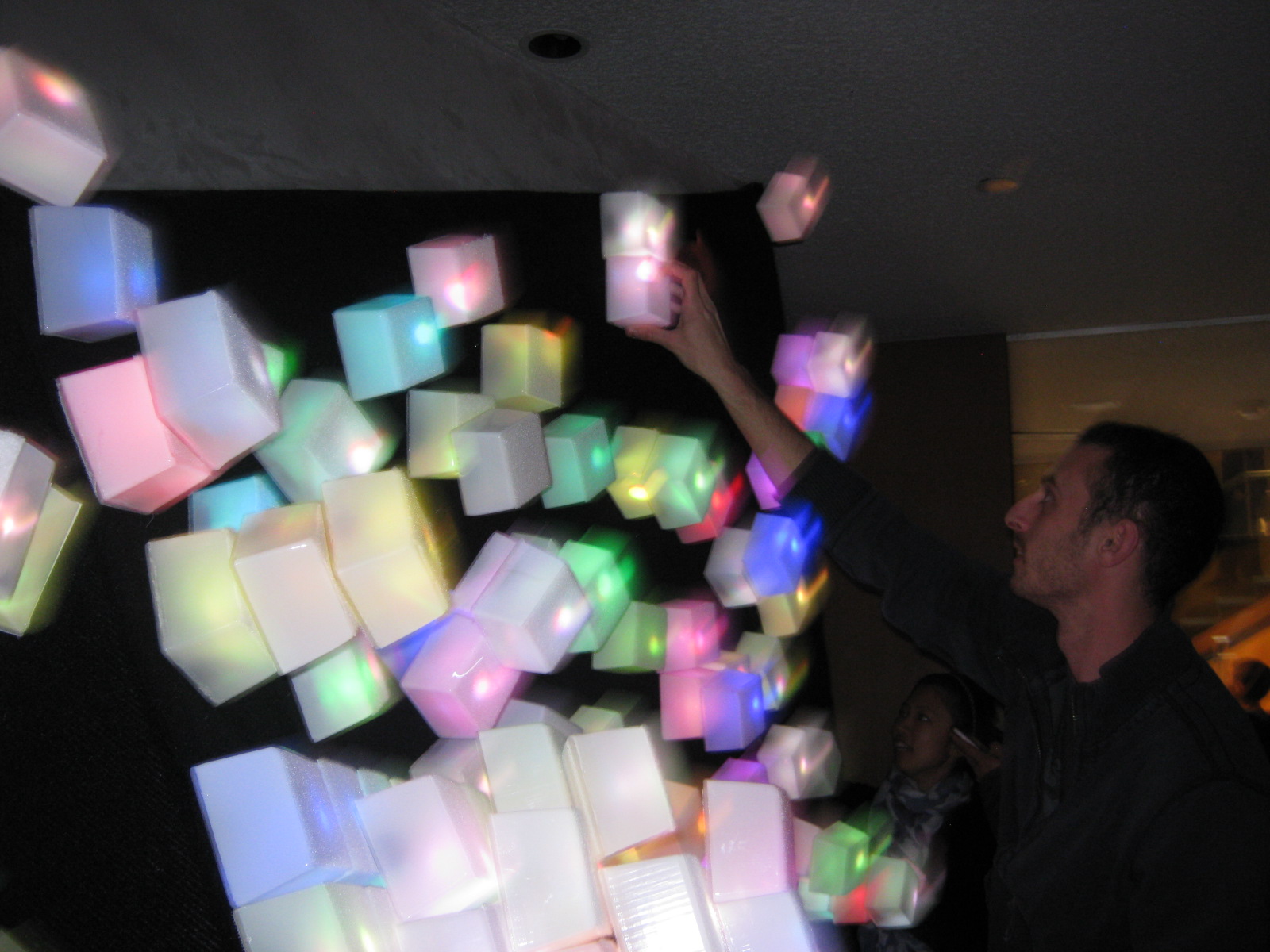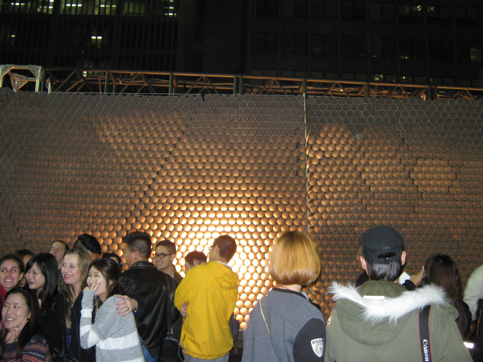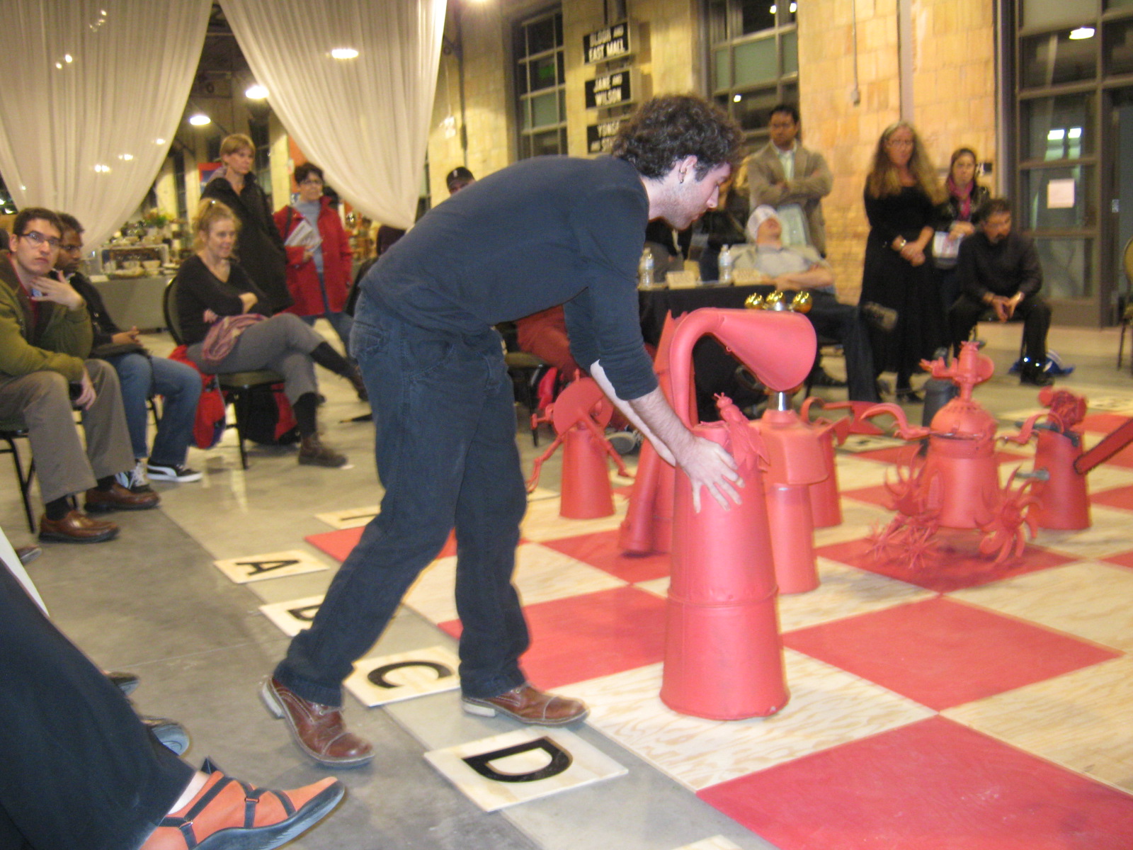 The Queen of the Parade, by Lisa Anita Wegner & Vanessa Lee Wishart. Multi-media artist/performer Lisa Anita Wegner, as the Queen, waves to the crowd from atop a 20-foot high gown.The Queen of the Parade – gown detail.Tortoise, by Michel de Broin. One of a series of assemblage sculptures made from picnic tables outside Campbell House. You could smell the cedar on this pleasantly cool fall evening. Warm cider was served there as well.Music Box, by John Dickson. A kinetic sculpture of musical instruments, creating eerie, otherworldly sounds all based on parts moving against each other.Ai Weiwei’s Forever Bicycles installation at Nathan Phillips Square.Forever Bicycles installation with Toronto City Hall in the background.Ferris Wheel, by Katharine Harvey.Parallax, by Idea Design Collective. A luminous, beehive-like effect – all done with cardboard tubes and light.(X)Static Clown Factory, by Ruth Spitzer & Claire Ironside. An interactive performance installation, where folks were invited to come up and do the clowns’ work. I think peeps got paid in balloons.Woman in the crowd with neon light hula hoop.There is an elephant in the truck, an indie installation by Laurence Vallières. Another impressive piece done with cardboard.Hybrid Globe, by Arthur Wrigglesworth, Mohammad Mehdi Ghiyaei & Mojtaba Samimi.Ad Astra, one of three indie projects by [R]ed[U]ux Lab at the Bata Shoe Museum.RevitaLight – another piece utilizing cardboard – at Bata Shoe Museum.Light_Scape, an interactive light installation at Bata Shoe Museum.On the way to Artscape Wychwood Barns, we encountered this sculpture artist at work on Bloor Street West. He uses only centre of gravity and balance to build these pieces.Yep, that’s a concrete block balancing on top. And set on fire to great effect.An assistant moves a piece on Chess Set, by Blandford Gates, an indie installation at Artscape Wychwood Barns.Chess players Tomas Krnan (L) and Peter Vavrak (R) play blindfolded, giving verbal instructions to their respective assistants to move pieces on the board. And having to remember where every piece is.