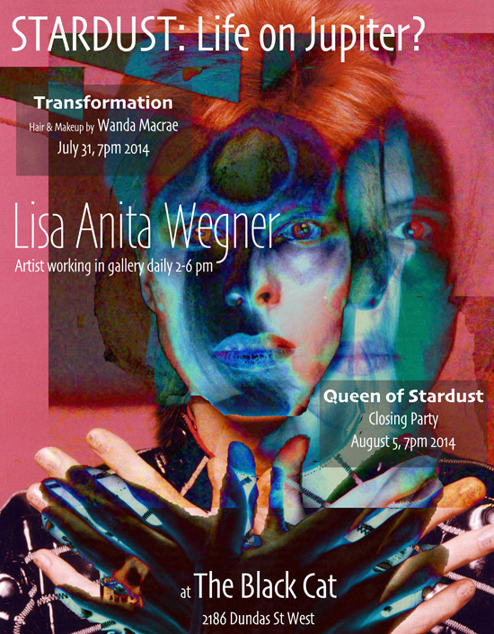 I dropped by The Black Cat Gallery (2186 Dundas Street West) last night for the Transformation at Lisa Anita Wegner’s opening of STARDUST: Life on Jupiter?, on until August 6 (no worries about what it says on the poster – I confirmed the date with Wegner).