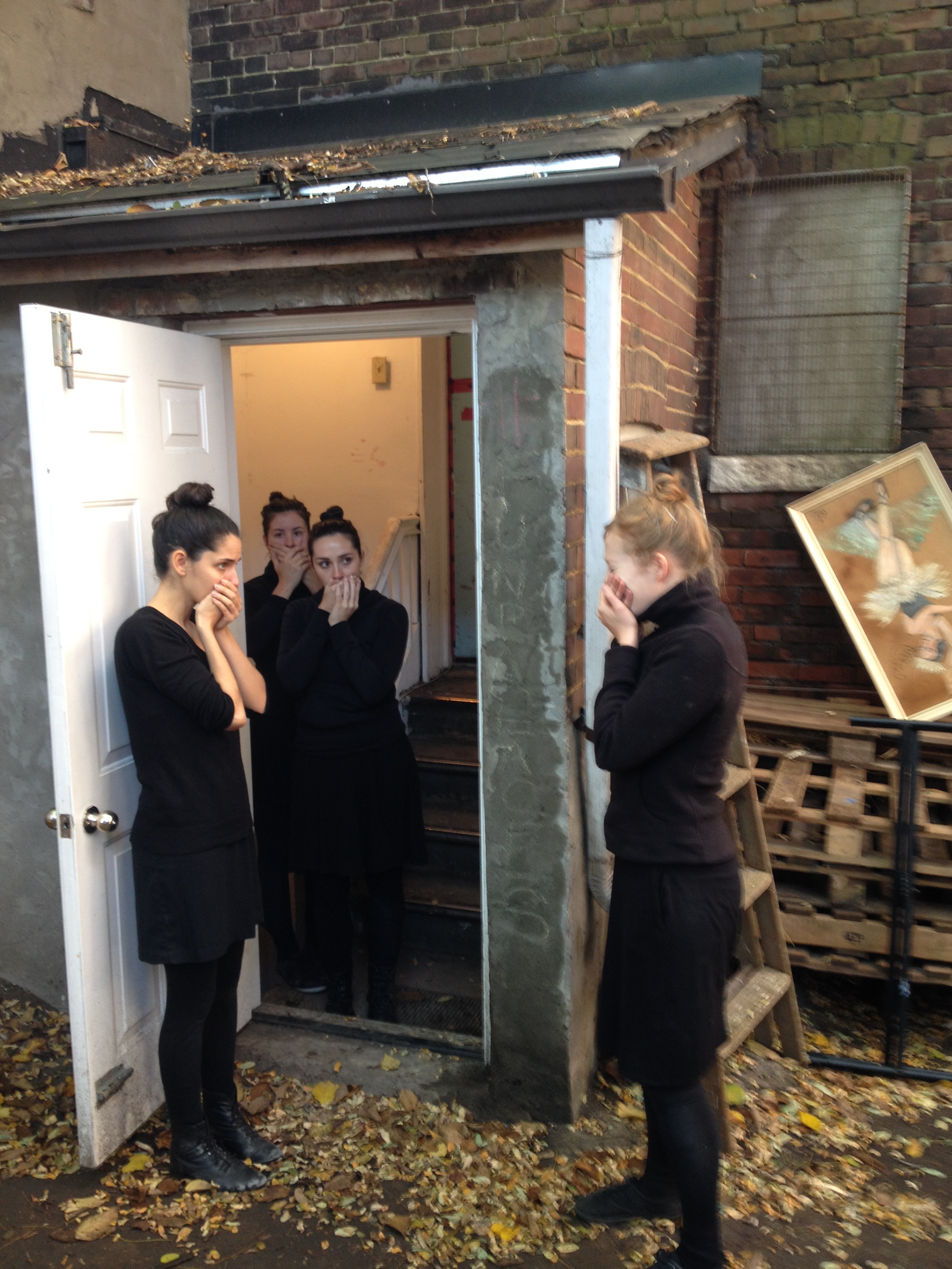 Our hostess alerts us that they’re coming. We can hear them before we see them. Four women dressed in black enter the yard through the gate, moving in music-less – but not soundless – rhythmic time. A ritual. A dance. A communion of community. As they exit into the gallery and down the stairs, suddenly, all is not well with one of the women. Our hostess beckons us to follow her downstairs, where we witness the rest of the action wordlessly play out, the smell of damp woods outdoors exchanged for the smell of damp stone indoors.