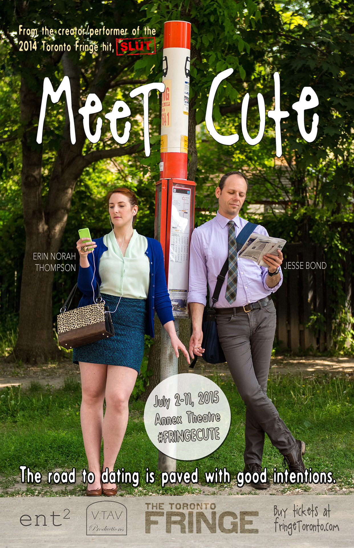 Another brilliant two-hander at Toronto Fringe is Erin Norah Thompson Entertainment and V.TAV Productions’ Meet Cute, written by Thompson, and directed by (in order of scene appearance) Ria Tienhaara, Julie Cohn and Adrianna Prosser – running at the Annex Theatre.