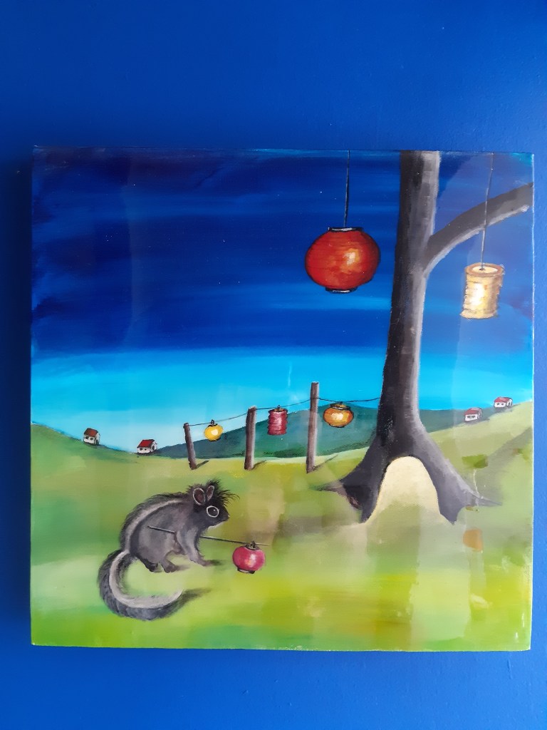 Party for One—Andrea Stokes. I saw this hanging in an exhibit 10 years ago at (former) Ottawa restaurant ZenKitchen, where friend of a friend Caroline Ishii was cofounder and chef; I never met Andrea in person, but we chatted over email as I arranged for shipment. I love the sharp colouring and melancholy whimsy in this piece—especially pointed right now during these times of isolation.