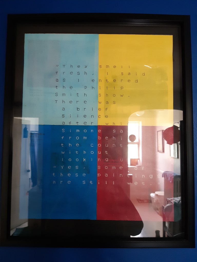 Multimedia text piece—Steve Rockwell. Can’t recall the exact name of this piece, but I saw it at an exhibit at the (former) Fran Hill Gallery and loved it. The text comes from an actual conversation he had with a gallery owner; hilarious in its dry humour. Also love the colour and design; it reminds me of a heraldic banner—and is meant to hang from the space where its mounted.