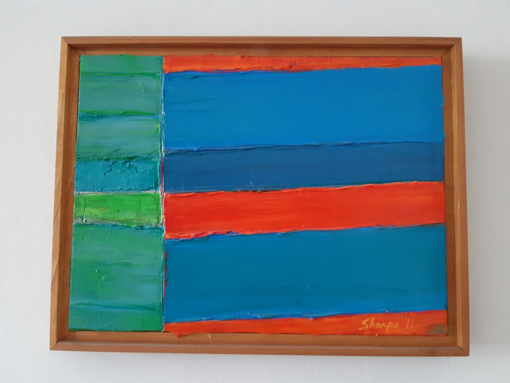 On Some Faraway Beach #20—the late Blair Sharpe. I met/befriended Blair, the partner of friend/Environics Research colleague Brenda Sharpe, at an Environics winter holiday party and we hit it off immediately. This painting is another Fran Hill Gallery exhibit find; it makes me think of Adirondack chairs, and the brilliance of colour in the spaces where beach, water and sky meet. Sadly, Blair passed away a year ago; I’ll miss his creative spirit, his edgy sense of humour and his sharp, questioning mind.