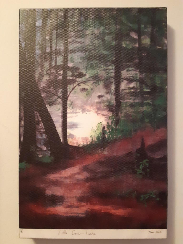 Little Cruiser Lake (canvass-mounted print)—Cecilia Booth. A gift from the artist, who is also a friend. I love the peaceful calm of nature in this piece. There’s also a magical, fairy tale-like quality—of emerging from a dark forest, into the light.