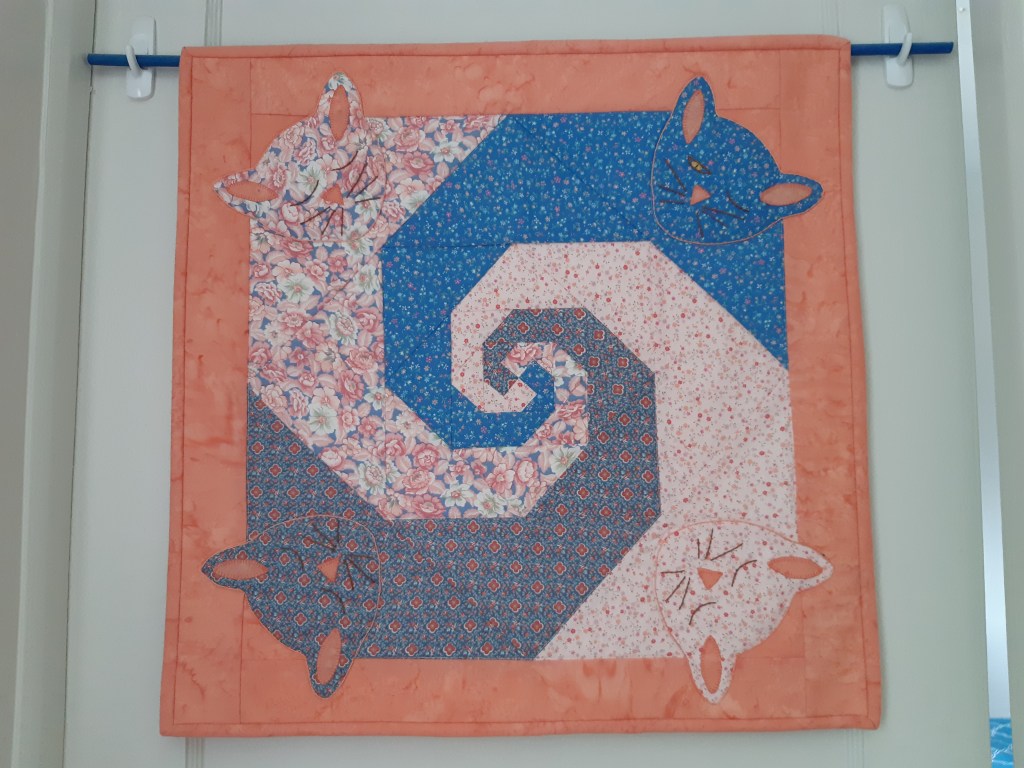 Guardian cats quilt—Martha Leonard. A gift from the artist’s daughter, my friend Kat Leonard. It reminds me of the Celtic faerie cats knot design. The cat is the guardian of the underworld.