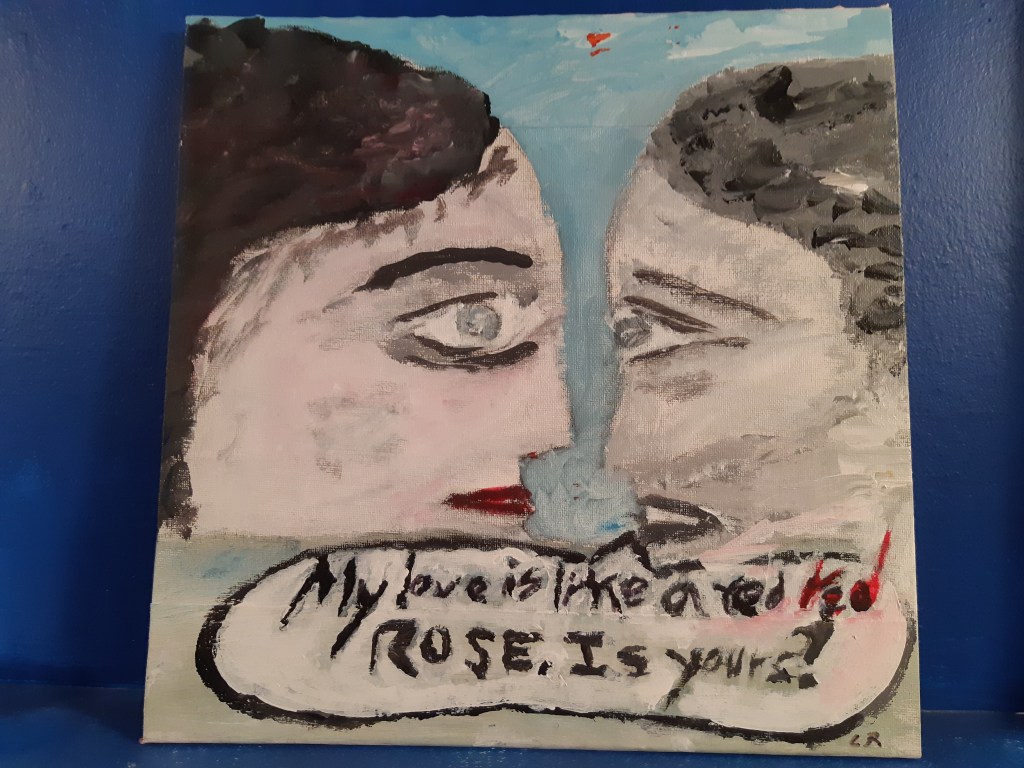 My love is like a red, red rose—Leon Rooke. I brought a bouquet of roses to a salon that Leon and Fran Hill were hosting at home in the Annex, prompting Fran to request that Leon gift me this painting. It evokes the lyrics of the famous Robert Burns poem in a whimsical way.