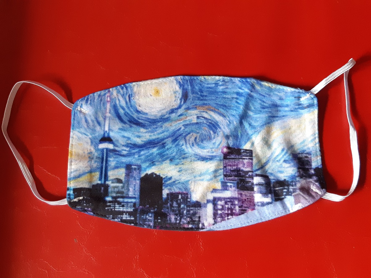 When it became evident that mask wearing was going to be a thing for a while, I figured it was time to purchase some reusable cloth ones. My first mask purchase was a gorgeous Van Gogh-inspired Toronto skyline designed by Alumnae Theatre friend, graphic artist/designer Suzanne Courtney, who you can find on Redbubble.